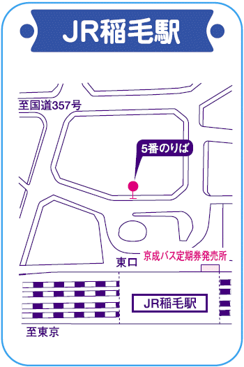 - JR稲毛駅前京成バス定期券発売所(月~金曜日15:00~17:00、土日祝9:00~13:00)